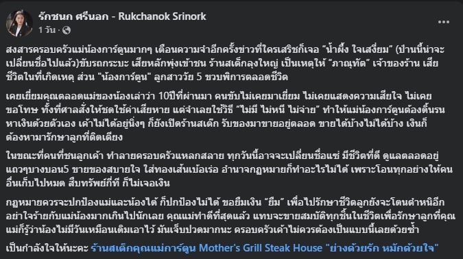 “ในขณะที่คนที่ชนลูกเค้า ทำลายครอบครัวแหลกสลาย ทุกวันนี้อาจจะเปลี่ยนชื่อแซ่ มีชีวิตที่ดี ดูแลตลอดอยู่แถวๆบางบอน5 ขายของสบายใจ ใส่ทองเส้นเบ้อเร่อ อำนาจกฏหมายก็ทำอะไรไม่ได้ เพราะโอนทุกอย่างให้คนอื่นเก็บไปหมด สืบทรัพย์กี่ที ก็ไม่เจอเงิน”
