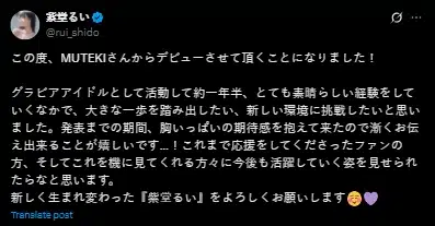 รูอิ หรือ รุยจัง เปิดใจผ่าน X ระบุว่า ฉันมีความยินดีที่จะประกาศว่าฉันจะได้เปิดตัวกับ MUTEKI! ฉันถ่ายแบบกราเวียร์มาเกือบครึ่งปีแล้ว และได้รับประสบการณ์ที่ดีมาก ๆ แต่เธอต้องการที่จะก้าวไปข้างหน้าและท้าทายตัวเองในสภาพแวดล้อมใหม่ ๆ ขอบคุณแฟน ๆ ที่สนับสนุนกันมาตลอด และหวังว่าคนที่เพิ่งรู้จักฉันผ่านโอกาสใหม่นี้ จะได้เห็นฉันในบทบาทอื่น ๆ ต่อไปในอนาคต