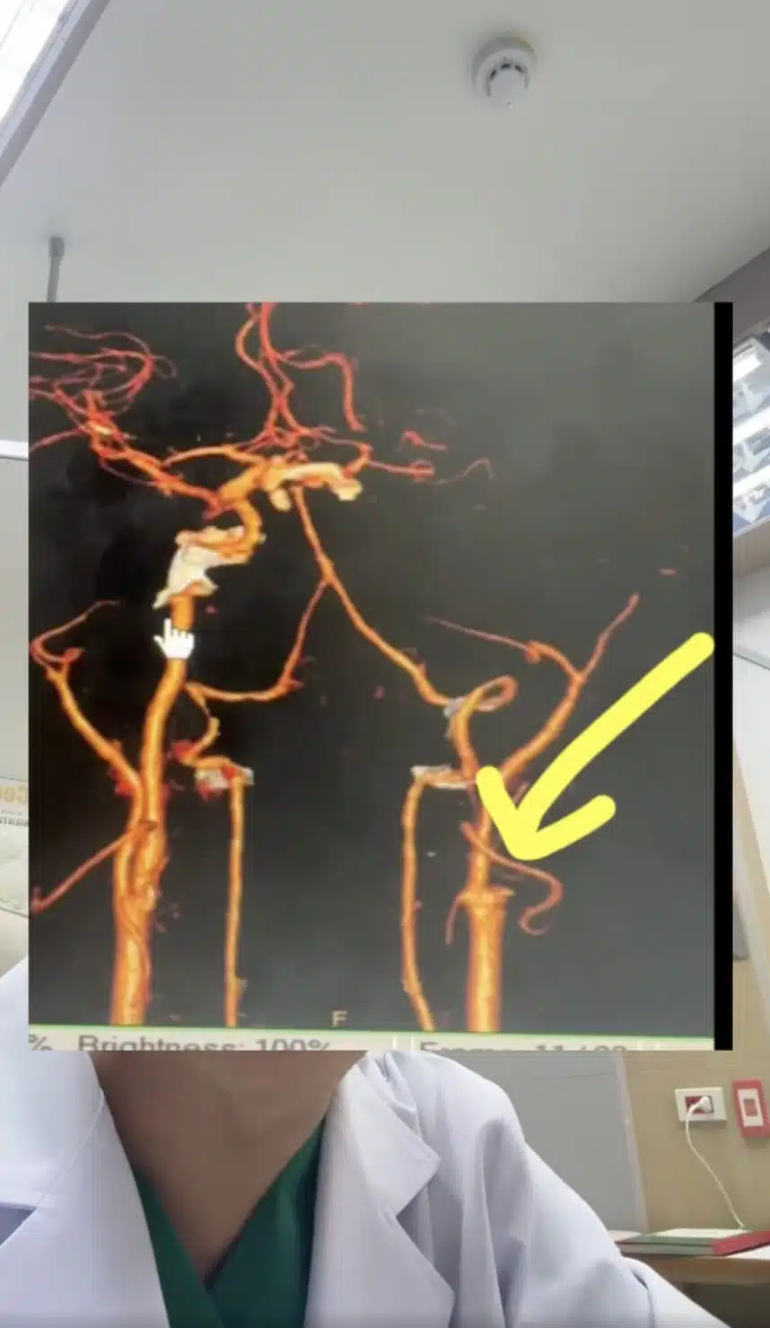 หมอประชาอธิบายว่า การนวดคอแรง ๆ หรือกดคลึงตรงเส้นเลือดคาโรติด (Carotid Artery) ซึ่งเป็นเส้นเลือดใหญ่อยู่บริเวณคอด้านหน้า หากกดแรงหรือผิดวิธี อาจทำให้เส้นเลือด “ปริแตก” หรือเกิดภาวะที่เรียกว่า Arterial Dissection ซึ่งส่งผลให้เลือดซึมเข้าไปในผนังหลอดเลือด จนกลายเป็นลิ่มเลือดและไปอุดตันในสมอง ทำให้เกิดภาวะ สโตรก หรือ หลอดเลือดสมองตีบ/แตกเฉียบพลัน ได้ทันที