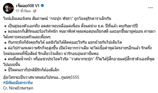 สุดท้ายก็ออกมายอมรับ สำหรับคู่รักคนดังอย่าง กระทิง ขุนณรงค์ กับ กระปุก พลอยนิรา ที่ล่าสุดฝ่ายหญิงออกมาให้สัมภาษณ์ว่า ทั้งคู่ตัดสินใจยุติความสัมพันธ์กันแล้วตั้งแต่ช่วงเดือนธันวาคม 2567 ที่ผ่านมา ซึ่งก่อนหน้านี้เพจดัง เจ๊มอย108 V1 ได้ออกมาโพสต์คำใบ้เกี่ยวกับคู่รักดาราเลิกกัน โดยใช้คีย์เวิร์ดว่า “ทำไมเราโชคดีจังวะ” ทำให้หลาย ๆ คนพุ่งเป้าไปที่คู่ของ กระทิง-กระปุก และสุดท้ายก็เป็นอย่างข่าวลือจริง ๆ