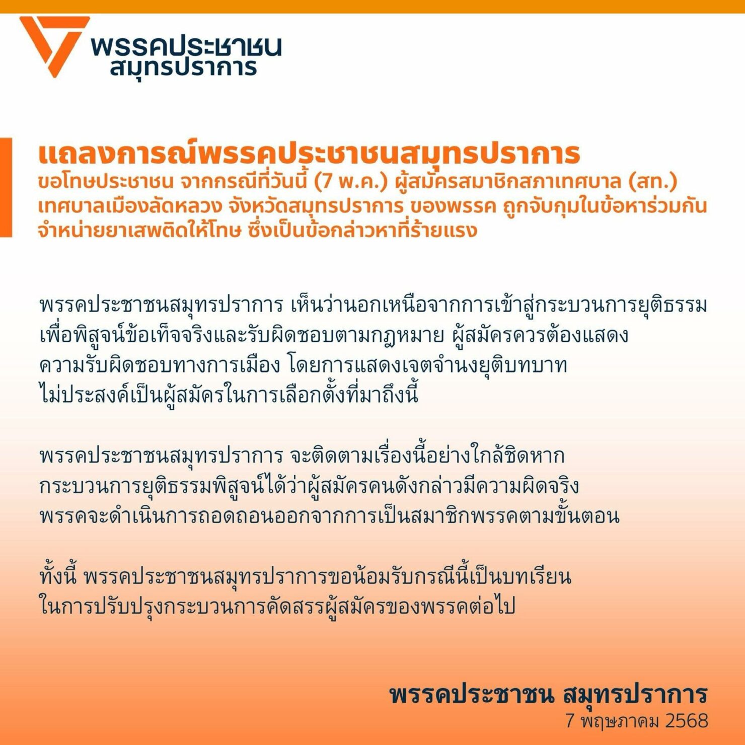 พรรคประชาชน สมุทรปราการ ได้โพสต์ข้อความเฟซบุ๊ก ออกแถลงการณ์ขอโทษประชาชน ภายหลังจากที่ ผู้สมัครสมาชิกสภาเทศบาล (สท.) ถูกจับกุมข้อหาค้ายาเสพติด