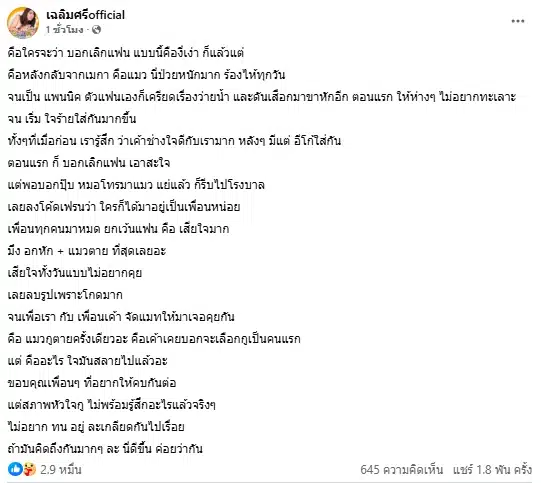 ต่อมาหลังจากโพสต์คลิปบอกเลยลงในสตอรีไอจีส่วนตัวได้ไม่นาน มิกซ์ เฉลิมศรี ก็ได้ออกมาโพสต์ชี้แจงสาเหตุของการจบรักครั้งนี้อย่างละเอียดผ่านทางหน้าเพจเฟซบุ๊ก เฉลิมศรีofficial ท่ามกลางเพื่อนพ้อง ชาวเน็ต และแฟนคลับร่วมคอมเมนต์ส่งกำลังใจ