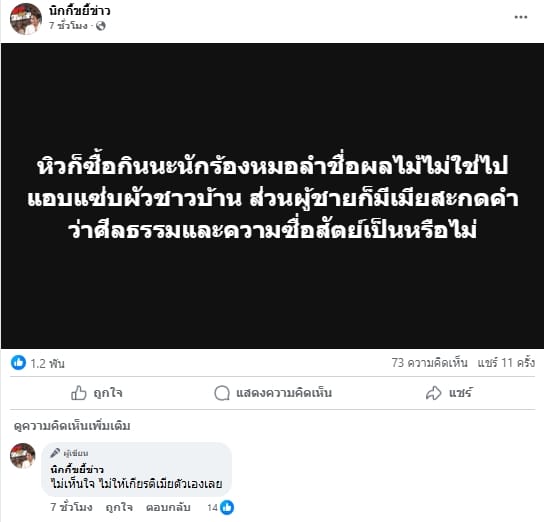 ห่างกันไม่นานนิกกี้ก็โพสต์ถึงเรื่องนี้เพิ่มเติมอีกครั้ง โดยระบุว่า “หิวก็ซื้อกินนะนักร้องหมอลำชื่อผลไม้ไม่ใช่ไปแอบแซ่บผัวชาวบ้าน ส่วนผู้ชายก็มีเมียสะกดคำว่าศีลธรรมและความซื่อสัตย์เป็นหรือไม่” แถมในคอมเมนต์ยังแอบติฝ่ายชายด้วยว่า “ไม่เห็นใจ ไม่ให้เกียรติเมียตัวเองเลย”