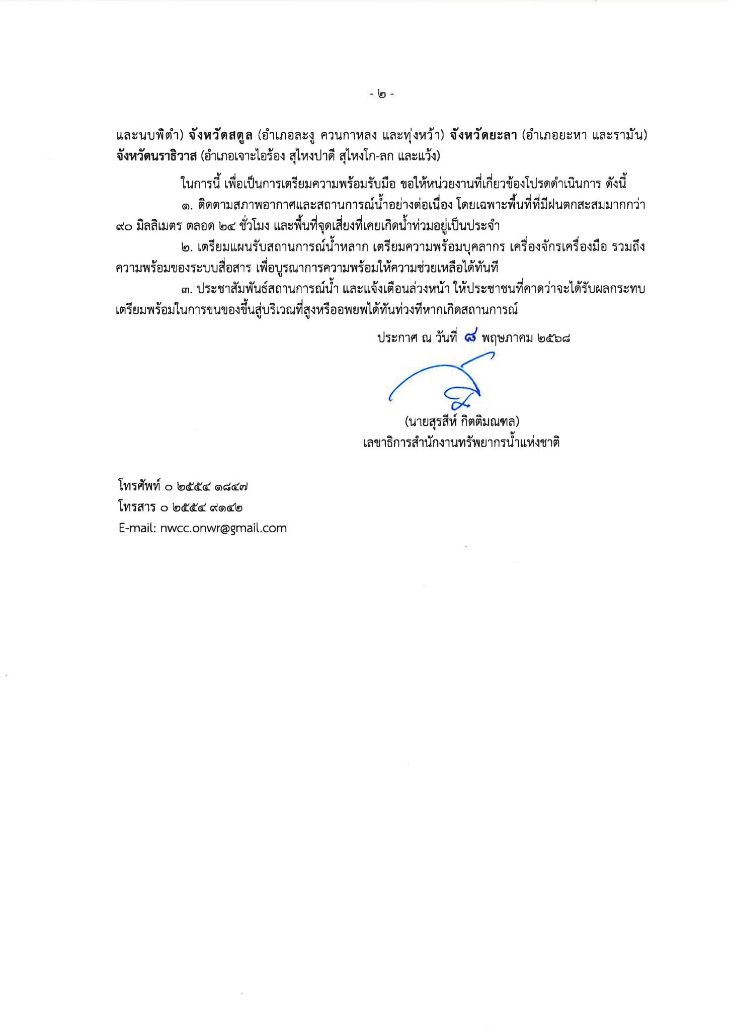 ภายหลังจากทางกรมอุตุนิยมวิทยา ได้มีออกมาแจ้งการเกิดพายุฤดูร้อน เป็นเหตุให้ทาง สำนักงานทรัพยากรน้ำแห่งชาติ ได้ออกมาประเตือนประชาชนให้เฝ้าระวังสถานการณ์ “น้ำท่วมเฉียบพลัน และน้ำป่าไหลหลาก” ความว่า