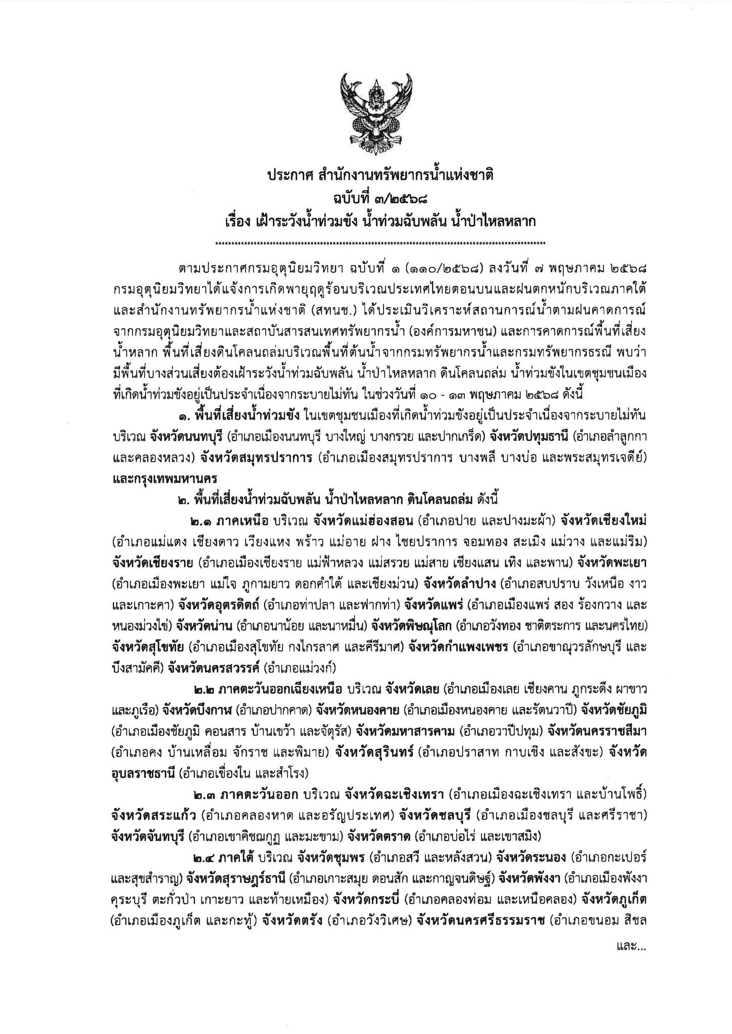 และสำนักงานทรัพยากรน้ำแห่งชาติ (สทนช.) ได้ประเมินวิเคราะห์สถานการณ์น้ำตามฝนคาดการณ์จากกรมอุตุนิยมวิทยาและสถาบันสารสนเทศทรัพยากรน้ำ (องค์การมหาชน) และการคาดการณ์พื้นที่เสี่ยงน้ำหลาก พื้นที่เสี่ยงดินโคลนถล่มบริเวณพื้นที่ต้นน้ำจากกรมทรัพยากรน้ำและกรมทรัพยากรธรณี พบว่า มีพื้นที่บางส่วนเสี่ยงต้องเฝ้าระวังน้ำท่วมฉับพลัน น้ำป่าไหลหลาก ดินโคลนถล่ม น้ำท่วมขังในเขตชุมชนเมืองที่เกิดน้ำท่วมขังอยู่เป็นประจำเนื่องจากระบายไม่ทัน ในช่วงวันที่ 10 – 13 พฤษภาคม 2568 ดังนี้
