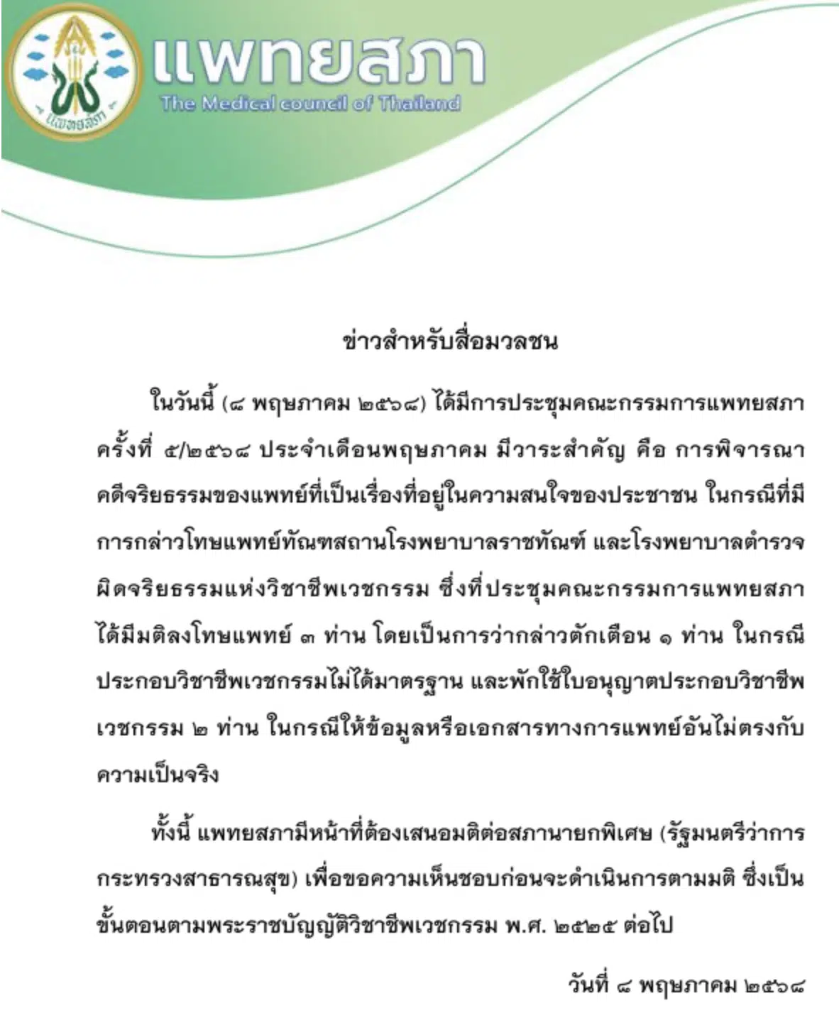 1 ราย ถูกว่ากล่าวตักเตือนในข้อหา “ประกอบวิชาชีพเวชกรรมไม่ได้มาตรฐาน”