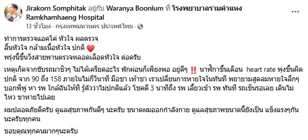 ล่าสุด เอ๊ะ จิรากร ได้มีการโพสต์เล่าอาการที่เกิดขึ้น พร้อมทั้งอัปเดตการรักษาผ่านทางเฟซบุ๊ก Jirakorn Somphitak ระบุว่า “ทำการตรวจแอคโค่ หัวใจ ผลตรวจ ลิ้นหัวใจ กล้ามเนื้อหัวใจ ปกติ พรุ่งนี้ขึ้นวิ่งสายพานตรวจหลอดเลือดหัวใจ ต่อครับ