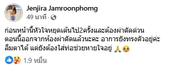 ด้านภรรยาได้มีการโพสต์อัปเดตอาการล่าสุดของ จ่าลอด ไทบ้าน ผ่านทางเฟซบุ๊กส่วนตัว Jenjira Jamroonphomg เผยว่า “ก่อนหน้านี้หัวใจหยุดเต้นไป2ครั้งและต้องผ่าตัดด่วน ตอนนี้ออกจากห้องผ่าตัดแล้วนะคะ อาการยังทรงตัวอยู่ค่ะ ลืมตาได้ แต่ยังต้องใส่ท่อช่วยหายใจอยู่”