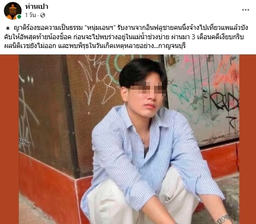 เพจ ท่านเปา แฉ “รินทร์” อินฟลูเอนเซอร์ จ้าง “น้องมาร์ค” เด็กเอนฯ ไปนอกสถานที่ สุดท้ายกลายเป็นศพอยู่ข้างแพ