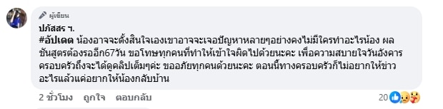 ขณะที่ล่าสุดทางเฟซบุ๊ก ปภัสสร ฯ. ได้มีการโพสต์ข้อความอัปเดตข้อมูลอีกครั้ง โดยระบุว่า “#อัปเดต น้องอาจจะตัดสินใจเอง เขาอาจจะเจอปัญหาหลาย ๆ อย่าง คงไม่มีใครทำอะไรน้อง ผลชันสูตรต้องรออีก 67 วัน ขอโทษทุกคนที่ทำให้เข้าใจผิดไปด้วยนะคะ เพื่อความสบายใจวันอังคารครอบครัวถึงจะได้ดูคลิปเต็ม ๆ ค่ะ ขออภัยทุกคนด้วยนะคะ ตอนนี้ทางครอบครัวก็ไม่อยากให้ข่าวอะไรแล้วแค่อยากให้น้องกลับบ้าน”