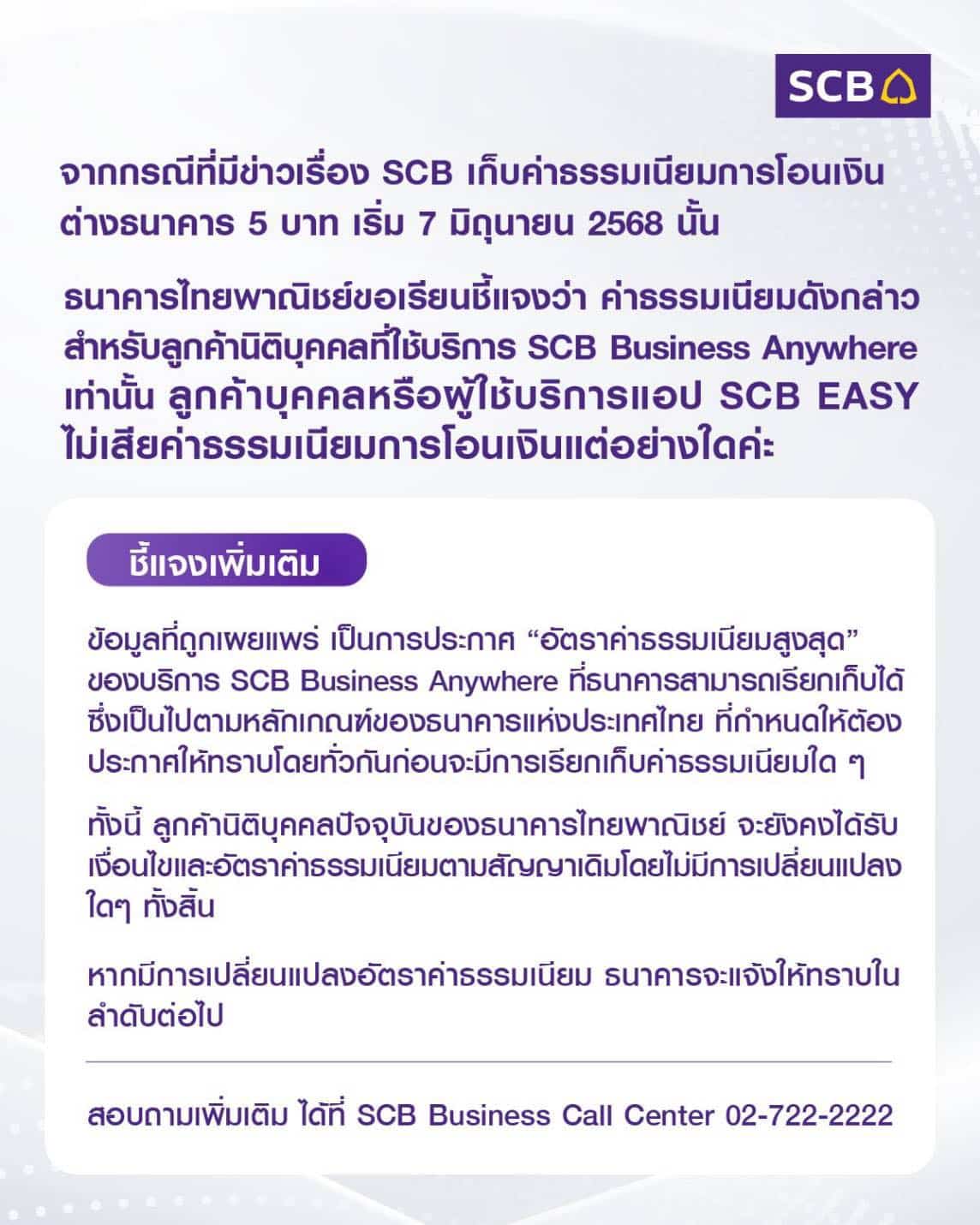 SCB ชี้แจงเอง ค่าธรรมเนียนโอนข้ามธนาคาร 5 บาท สำหรับนิติบุคคล