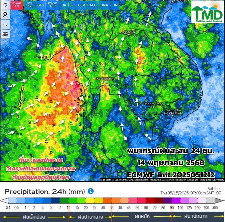 พยากรณ์ฝนสะสมรายวัน (ทุกๆ 24 ชม.:(นับตั้งแต่ 07.00น. ถึง 07.00น.วันรุ่งขึ้น) ลมที่ระดับ 925hPa (750 ม.)15 วันล่วงหน้า ระหว่าง 13-27 พ.ค.68 init. 2025051212 จากศูนย์พยากรณ์อากาศระยะกลางยุโรป (ECMWF) วิเคราะห์ตามผลจากแบบจำลองฯ เฉดสีแดงหมายถึงฝนหนัก สีเขียวหมายถึงฝนเล็กน้อย