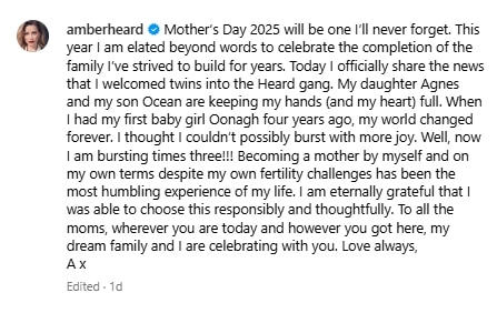 “Mother’s Day 2025 will be one I’ll never forget. This year I am elated beyond words to celebrate the completion of the family I’ve strived to build for years. Today I officially share the news that I welcomed twins into the Heard gang. My daughter Agnes and my son Ocean are keeping my hands (and my heart) full. When I had my first baby girl Oonagh four years ago, my world changed forever. I thought I couldn’t possibly burst with more joy. Well, now I am bursting times three!!! Becoming a mother by myself and on my own terms despite my own fertility challenges has been the most humbling experience of my life. I am eternally grateful that I was able to choose this responsibly and thoughtfully. To all the moms, wherever you are today and however you got here, my dream family and I are celebrating with you. Love always,