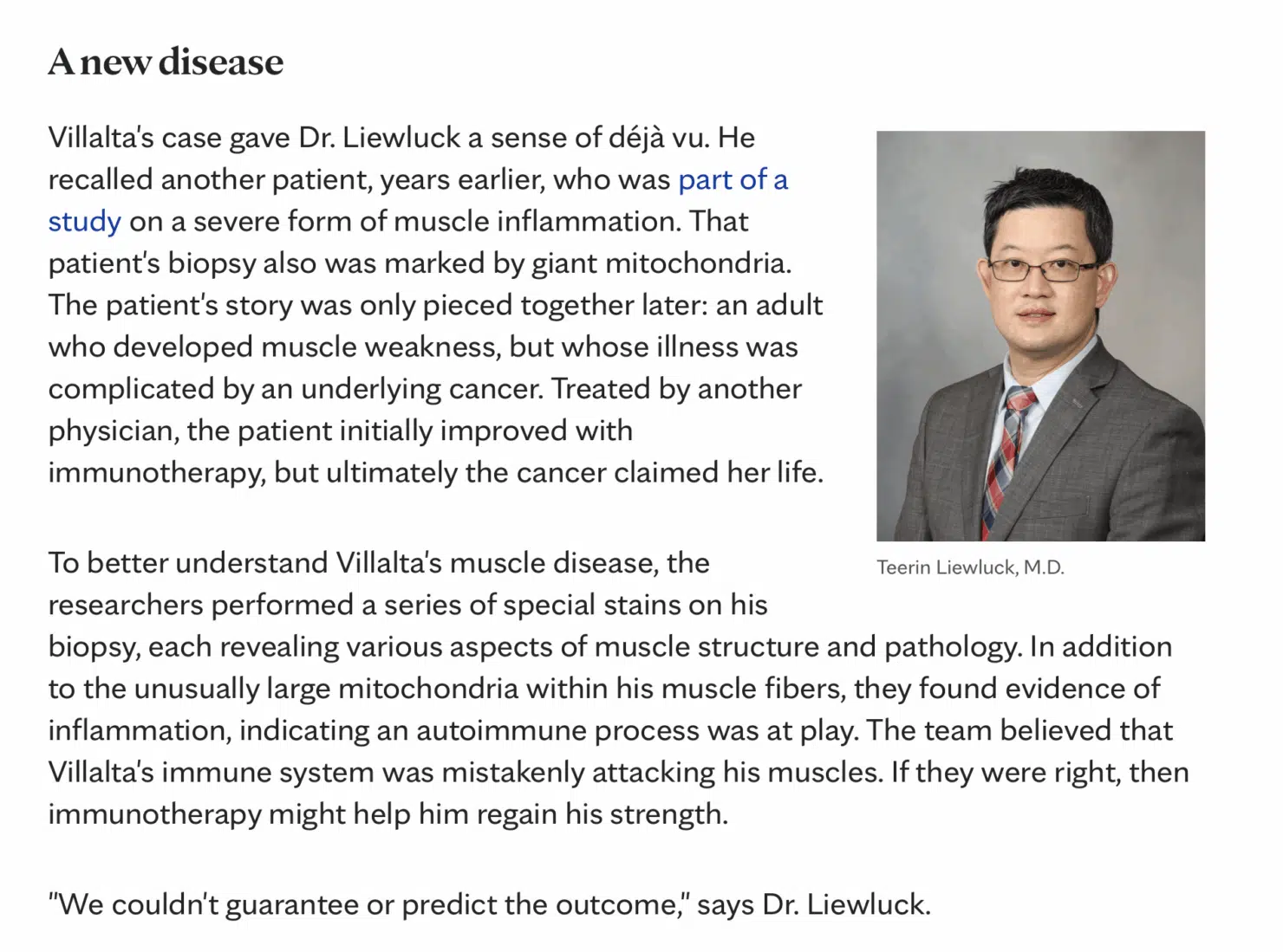 ไทยเกอร์ไปค้นข้อมูลงานวิจัยเพิ่มเกี่ยวกับการศึกษาโรคนี้ พบว่า นายแพทย์ธีรินทร์ ลิ่วลักษณ์ เป็นผู้วิจัยหลัก ร่วมกับคณะผู้วิจัยจากหลากหลายหน่วยงาน เช่น เมโยคลินิก-โรเชสเตอร์, โรเชสเตอร์, มินนิโซตา, สหรัฐอเมริกา เฮนเนพินเฮลท์แคร์, มินนีแอโพลิส, มินนิโซตา, สหรัฐอเมริกา มหาวิทยาลัยนอร์ทแคโรไลนา, แชเปิลฮิลล์ มหาวิทยาลัยนอร์ทเวสเทิร์น, ชิคาโก, อิลลินอยส์, มหาวิทยาลัยนอร์ทเวสเทิร์น, ชิคาโก, อิลลินอยส์, จอห์นส์ฮอปกินส์อารัมโคเฮลท์แคร์, ดาห์ราน, ซาอุดีอาระเบีย โรงพยาบาลเด็กเนชั่นไวด์, โคลัมบัส, โอไฮโอ, สหรัฐอเมริกา โรงพยาบาลศิริราช, มหาวิทยาลัยมหิดล