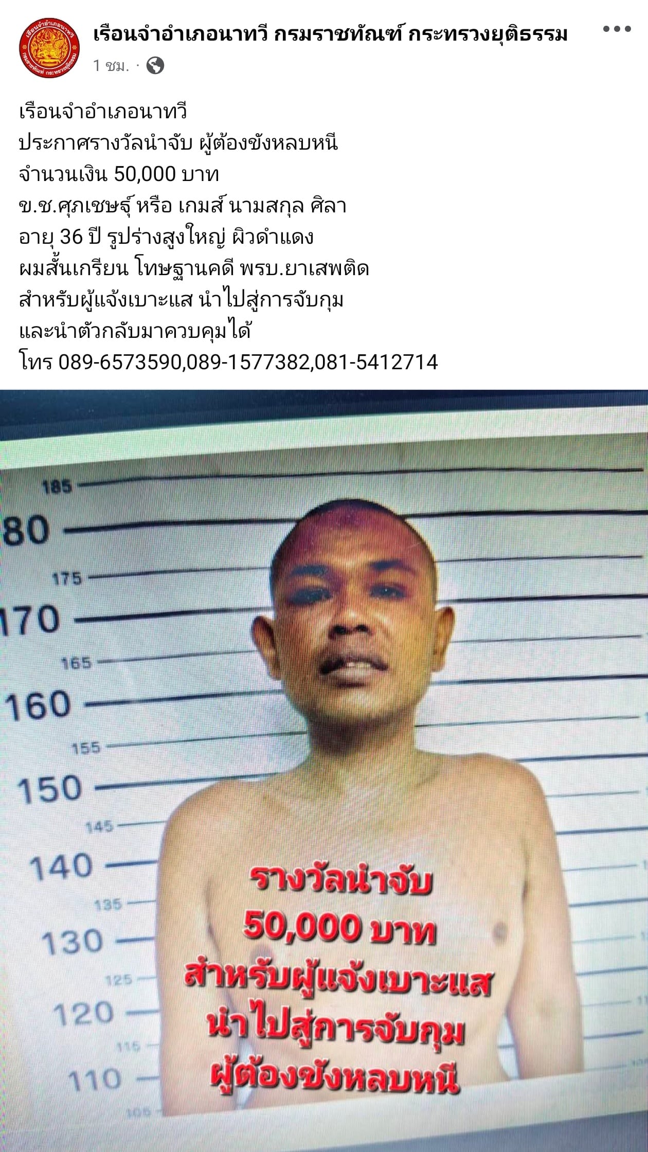 เมื่อวันที่ 13 พฤษภาคม 2568 เพจเฟซบุ๊กของ เรือนจำอำเภอนาทวี กรมราชทัณฑ์ กระทรวงยุติธรรม ได้โพสต์ภาพและข้อความประกาศตามหาตัว นายศุภเชษฐุ์ หรือ เกมส์ นามสกุล ศิลา อายุ 36 ปี ผู้ต้องขังในคดียาเสพติดที่หลบหนีออกจากเรือนจำ พร้อมตั้งเงินรางวัล 50,000 บาท สำหรับผู้แจ้งเบาะแสที่นำไปสู่การจับกุม