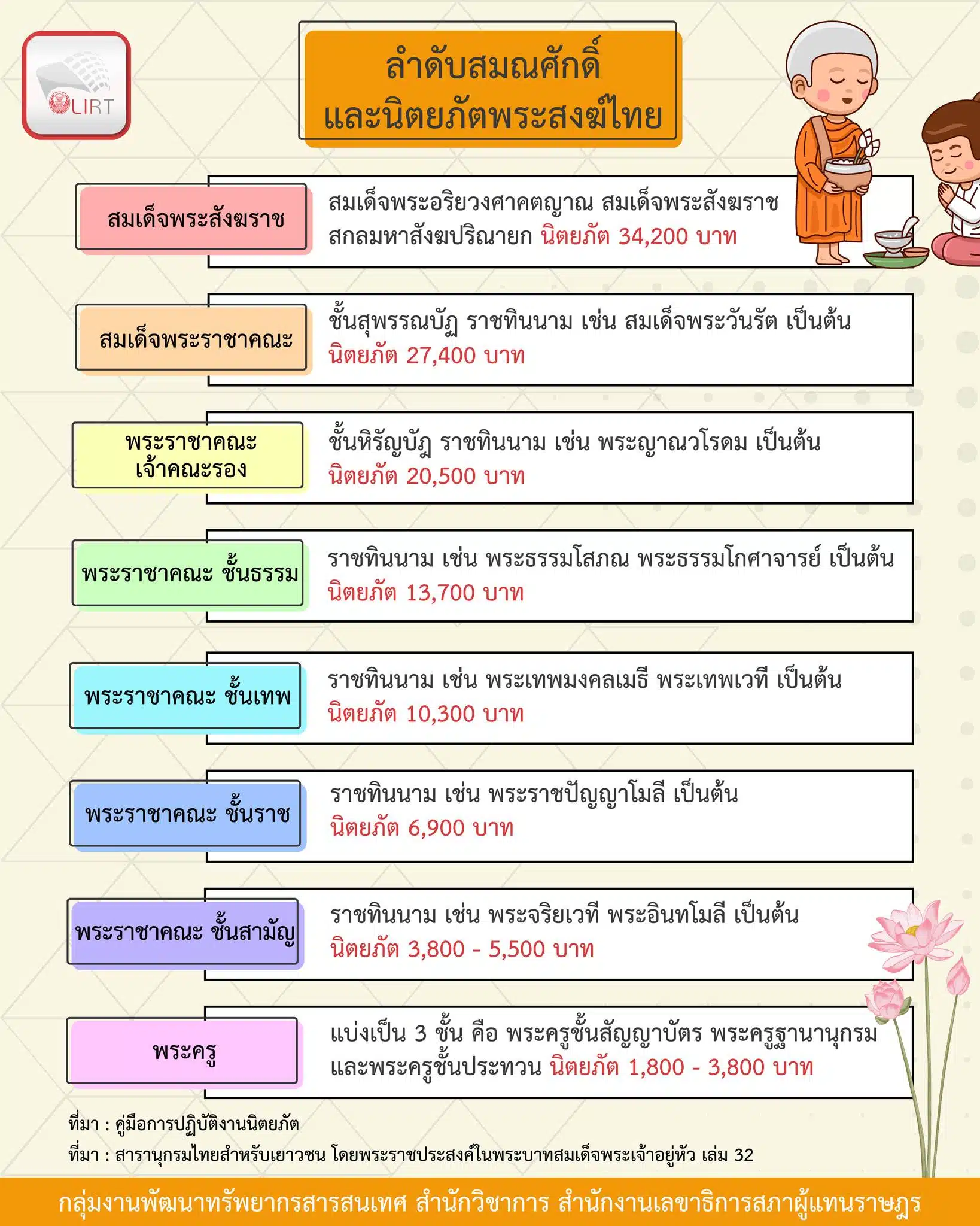 - พระอธิการ (เจ้าอาวาสวัดราษฎร์ที้ไม่เป็นพระครูสัญญาบัตร) 1,800 บาท
