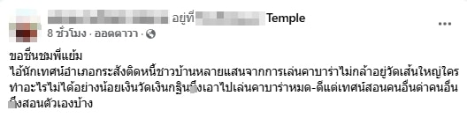 กลายเป็นโพสต์ที่ถูกแชร์ต่อกันและถูกพูดถึงกันเป็นวงกว้าง เมื่อมีพระรูปหนึ่งใช้เฟซบุ๊กส่วนตัวในการโพสต์ข้อความเปิดโปงพฤติกรรม “พระนักเทศน์ชื่อดัง” รูปหนึ่งซึ่งเป็นถึง เจ้าอาวาสวัดป่า ในจ.บุรีรัมย์ ว่า ไม่กล้ากลับมานอนวัด เพราะถูกชาวบ้านตามทวงหนี้ที่ยืมเอาไปเล่นบาคาร่าจนหมดตัว