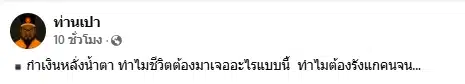 เพจ ท่านเปา แชร์คลิป ครอบครัวกำเงิน หลั่งน้ำตากลางไลฟ์ ตัดพ้อชีวิตปัจจุบันกำลังจะหมดตัว เงินทองจำนำหมด เพราะต้องเสียค่าดำเนินคดี ชาวเน็ตวิจารณ์สนั่น