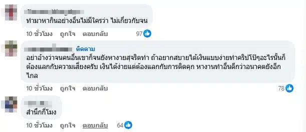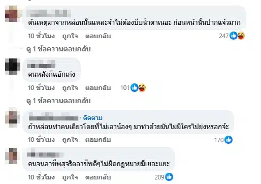 ด้านชาวเน็ตที่ได้เห็นคลิปดังกล่าวต่างก็เข้ามาแสดงความคิดเห็นกันเป็นจำนวนมาก โดยส่วนใหญ่มองเป็นเสียงเดียวกันว่า จริง ๆ ไม่ควรทำแบบนี้ตั้งแต่แรก ทำคนเดียวไม่ว่าแต่ดันลากน้อง ๆ มาทำด้วย แล้วจะมาอ้างว่าเป็นคนจนเลยต้องทำมันไม่ได้ เพราะมีงานสุจริตเยอะแยะที่คนจนคนอื่น ๆ เขาทำกัน