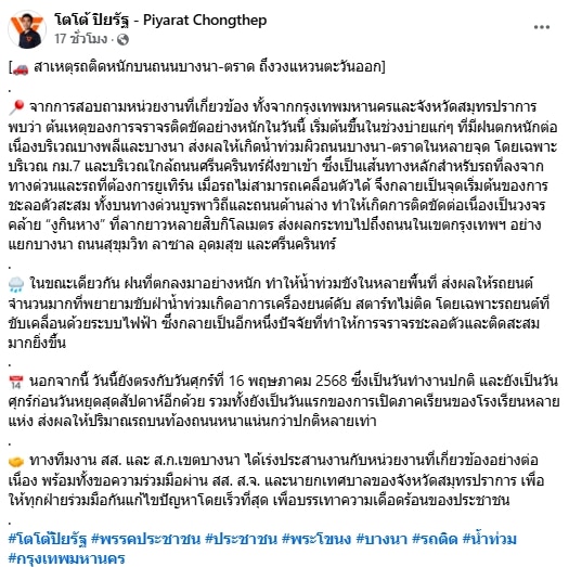 จากกรณีช่วงเย็นวานนี้ (16 พ.ค. 68) ถนนเส้นบางนา-ตราด เกิดรถติดสะสมยาวกว่า 31 กิโลเมตร ส่งผลให้การจราจรเป็นอำมพาตข้ามคืน ต่อมาทาง สส.โตโต้ ปิยรัฐ สส.กทม. จากพรรคประชาชน ก็ได้ออกมาโพสต์ชี้แจงสาเหตุ บางนารถติด ผ่านทางหน้าเฟซบุ๊กระบุว่า