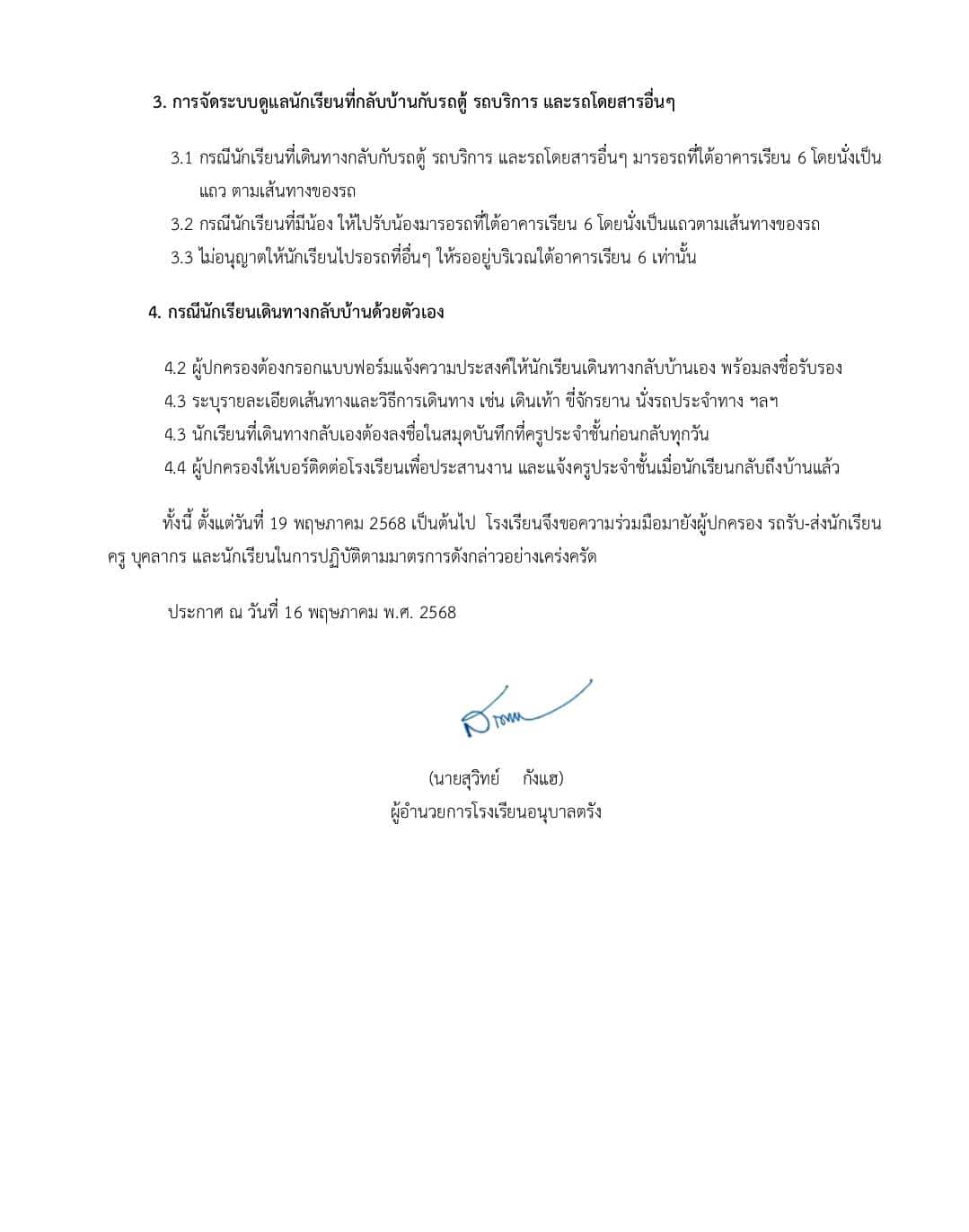 และได้ขอความอนุเคราะห์ไปยังสำนักงานเขตพื้นที่การศึกษาประถมศึกษาตรังเขต 1 ในการส่งนักจิตวิทยามาให้คำปรึกษา เยียวยากับนักเรียน ผู้ปกครองและครูที่ได้รับผลกระทบจากเหตุการณ์ครั้งนี้ รวมทั้งได้ปรับมาตรการและแนวทางการรับ-ส่งนักเรียนของโรงเรียนเพื่อความเป็นระเบียบ และเน้นความปลอดภัยของนักเรียน ผู้ปกครองเป็นสำคัญ ซึ่งจะดำเนินการตามมาตรการที่ปรับขึ้นใหม่ ตั้งแต่วันที่ 19 พฤษภาคม 2568 เป็นต้นไป”