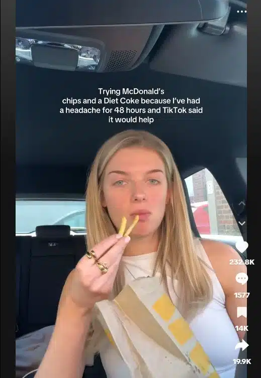 ประเด็นดังกล่าวกำลังกลายเป็นที่พูดถึงในโลกออนไลน์ เมื่อมีชาวเน็ตใน TikTok แห่แชร์คลิปที่มียอดวิวกว่า 3 ล้านครั้ง พร้อมแคปชั่นว่า “ลองสั่งเฟรนช์ฟรายส์แมคโดนัลด์กับโคล่า เพราะปวดหัวมาแล้ว 48 ชั่วโมง แล้วใน TikTok บอกว่าสิ่งนี้จะช่วยได้”