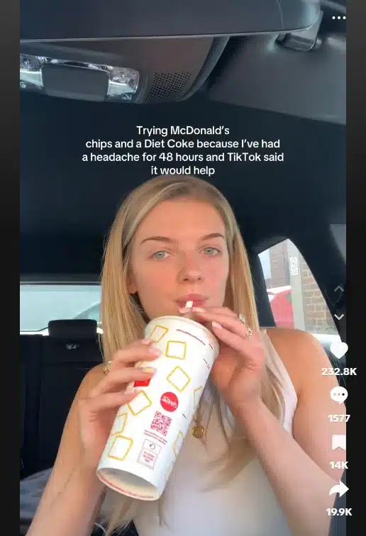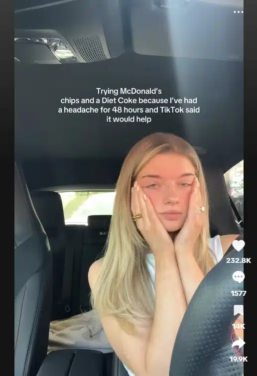 ประเด็นดังกล่าวกำลังกลายเป็นที่พูดถึงในโลกออนไลน์ เมื่อมีชาวเน็ตใน TikTok แห่แชร์คลิปที่มียอดวิวกว่า 3 ล้านครั้ง พร้อมแคปชั่นว่า “ลองสั่งเฟรนช์ฟรายส์แมคโดนัลด์กับโคล่า เพราะปวดหัวมาแล้ว 48 ชั่วโมง แล้วใน TikTok บอกว่าสิ่งนี้จะช่วยได้”