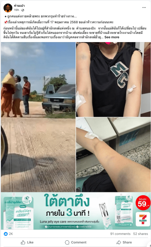 สาวโวย ถูกชายคล้ายพระยกพวกรุมทำร้าย ปมขัดแย้งครอบครัว โยงสำนักสงฆ์