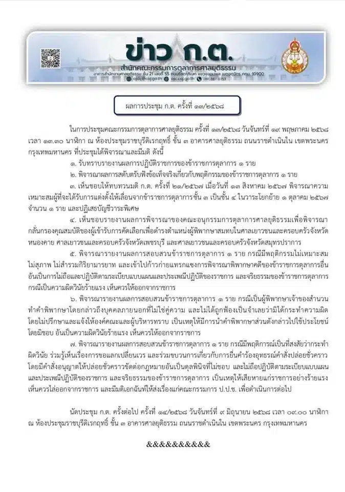 สำนักคณะกรรมการตุลาการศาลยุติธรรม ออกเอกสารแถลงการณ์ระบุว่า ในการประชุม ก.ต. ครั้งที่ 13/2568 วันจันทร์ที่ 19 พฤษภาคม 2568 เวลา 13.30 นาฬิกา ณ ห้องประชุมราชบุรีดิเรกฤทธิ์ ชั้น 3 อาคารศาลยุติธรรม ถนนราชดำเนินใน เขตพระนคร กรุงเทพมหานคร ที่ประชุมได้พิจารณาและมีมติ ดังนี้