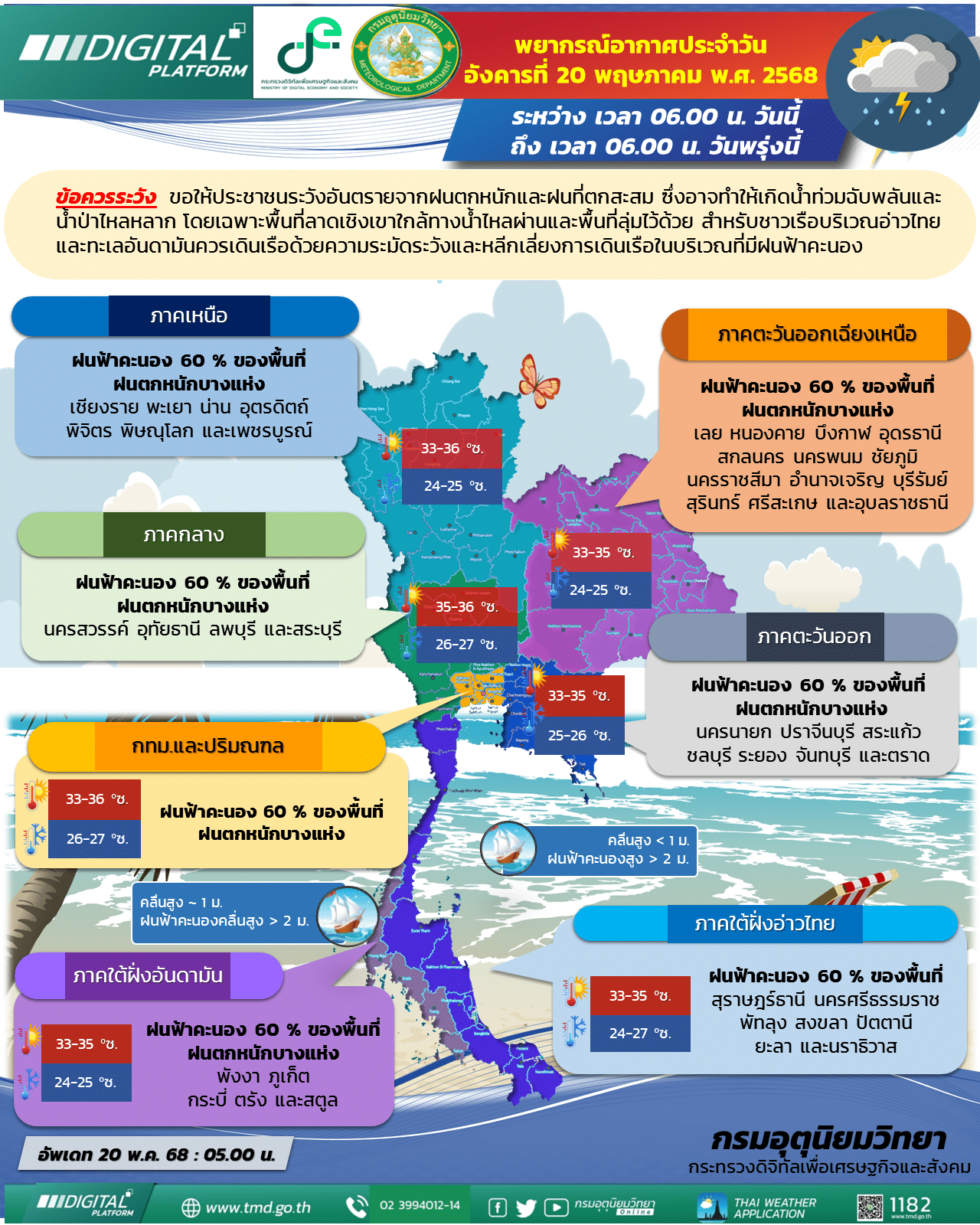 สถานการณ์ฝนฟ้ายังคงน่าเป็นห่วง วันที่ 20 พฤษภาคม 2568 กรมอุตุนิยมวิทยา ได้ออกประกาศพยากรณ์อากาศสำหรับ 24 ชั่วโมงข้างหน้า โดยคาดการณ์ว่าหลายภูมิภาคของประเทศไทยจะยังคงเผชิญกับสภาวะฝนตกหนักอย่างต่อเนื่อง ซึ่งจำเป็นต้องเฝ้าระวังผลกระทบที่อาจตามมาอย่างใกล้ชิด