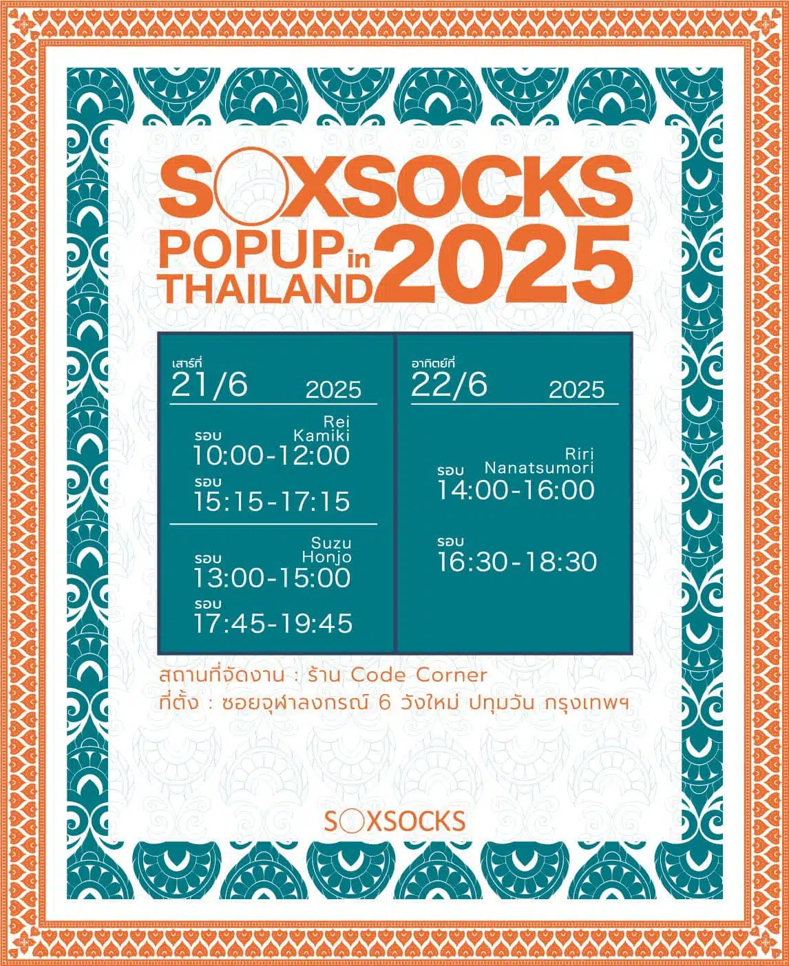 S◯XSOCKS แบรนด์เสื้อผ้าจากญี่ปุ่น ได้มีการประกาศว่าจะมีตั้ง POP Up Store ที่ประเทศไทย ซึ่งไฮไลท์อยู่ในครั้งนี้ พวเขาได้จัดการพาตัว 3 นางเอกหนังผู้ใหญ่ขวัญใจหนุ่มไทยอย่าง เรย์ คามิกิ (Rei Kamiki), ซูซู ฮอนโจ (Suzu Honjo) และ ริริ นานาสึโมริ (Riri Nanatsumori) มาร่วมงานอีกเวนท์ในครั้งนี้ด้วย ในวันที่ 21-22 มิถุนายนนี้ โดยมีรายละเอียดดังนี้