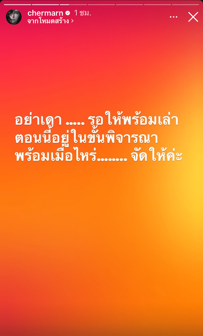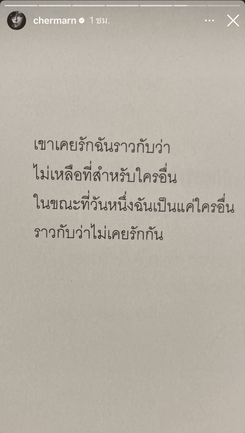 สตอรี่ถัดไปนักแสดงสาวแชร์ข้อความคำคมเกี่ยวกับความรักและคนเห็นแก่ตัวอีก 3 โพสต์ คือ “คนเห็นแก่ตัว จะไม่มีทางสำนึกในสิ่งที่ตัวเองทำกับคนอื่น จะจำแต่สิ่งที่ตัวเองโดนกระทำ”, “No matter how good you are, if you are in a wrong place, you are worthless.”, “เขาเคยรักฉันราวกับว่าไม่เหลือที่สำหรับใครอื่น ในขณะที่วันหนึ่งฉันเป็นแค่ใครอื่นราวกับว่าไม่เคยรักกัน”