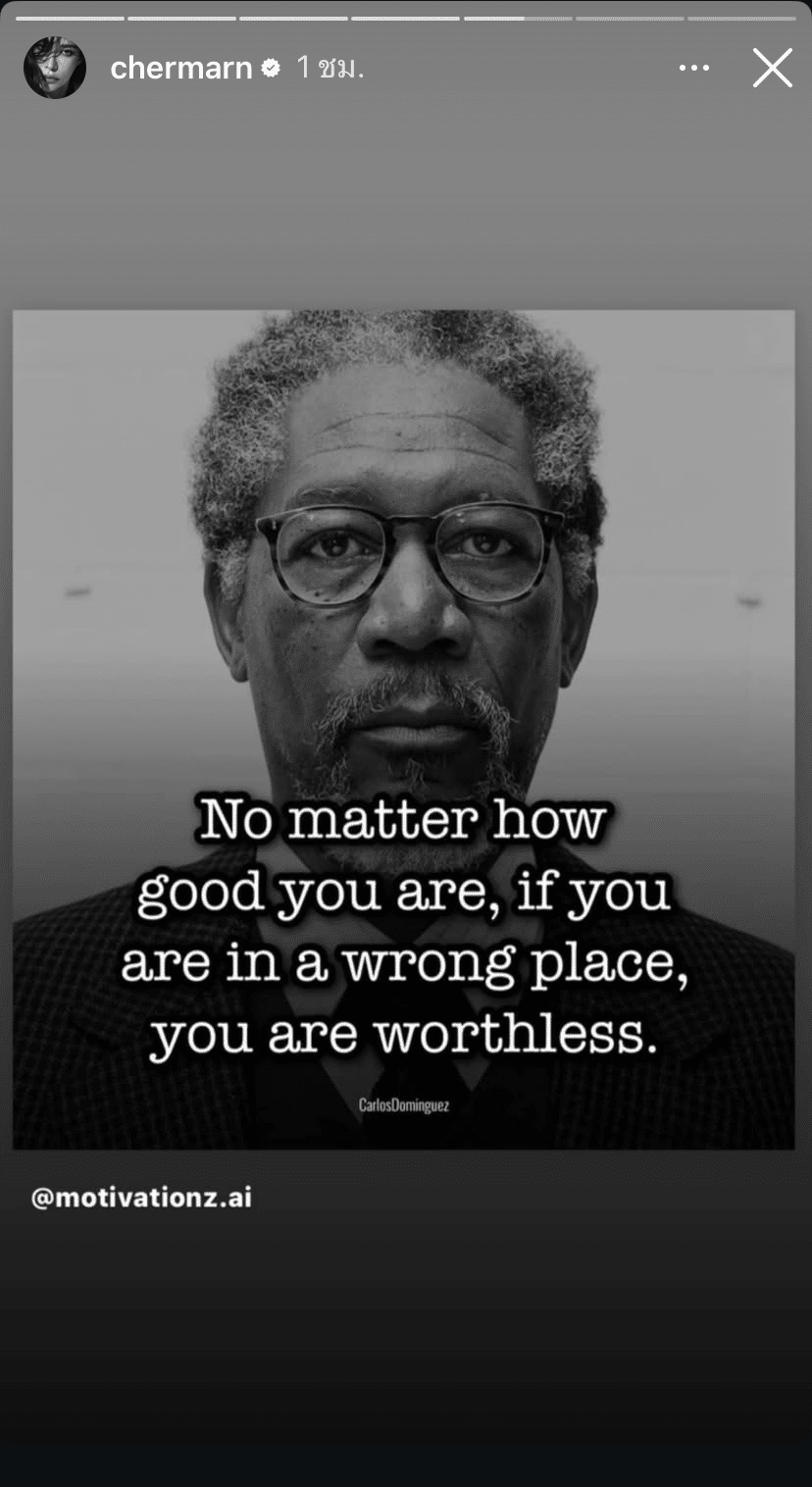 สตอรี่ถัดไปนักแสดงสาวแชร์ข้อความคำคมเกี่ยวกับความรักและคนเห็นแก่ตัวอีก 3 โพสต์ คือ “คนเห็นแก่ตัว จะไม่มีทางสำนึกในสิ่งที่ตัวเองทำกับคนอื่น จะจำแต่สิ่งที่ตัวเองโดนกระทำ”, “No matter how good you are, if you are in a wrong place, you are worthless.”, “เขาเคยรักฉันราวกับว่าไม่เหลือที่สำหรับใครอื่น ในขณะที่วันหนึ่งฉันเป็นแค่ใครอื่นราวกับว่าไม่เคยรักกัน”