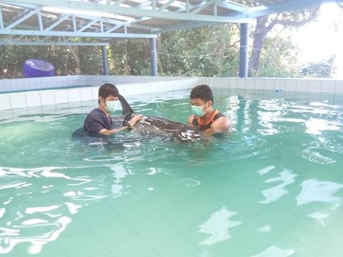 เจ้าหน้าที่กลุ่มสัตว์ทะเลหายาก ศวทม. เร่งช่วยเหลือโลมาริซโซส์ สายพันธุ์หายาก หลังพบเกยตื้นหาดไร่เลย์