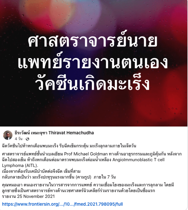 หมอ ธีระวัฒน์ เหมะจุฑา Thiravat Hemachudha ได้โพสต์เฟซบุ๊กระบุว่า ศาสตราจารย์ ไมเคิล โกลด์แมน เป็นแพทย์ผู้เชี่ยวชาญด้านอายุรกรรมและภูมิคุ้มกันในประเทศเบลเยียม. ก่อนหน้านี้ ศ.โกลด์แมนได้รับวัคซีนโควิด-19 ครบสองเข็ม. ประมาณ 5 ถึง 6 เดือนต่อมา เขาตรวจพบว่าเป็นมะเร็งต่อมน้ำเหลืองชนิด Angioimmunoblastic T cell Lymphoma (AITL).