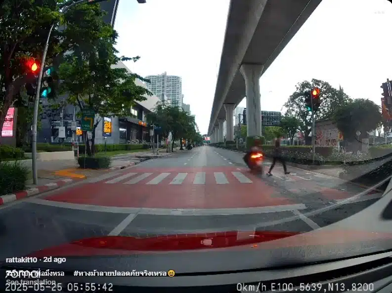 ปรากฎว่าเพียงไม่กี่ก้าวก่อนที่จะข้ามไปจนสดท้าย มีรถจักรยานยนต์คันหนึ่งขับมาด้วยความเร็วสูง พุ่งฝ่าไฟแดงไปแดงแบบหน้าตาเฉย แถมยังเกือบจะชนชายคนดังกล่าวอีกด้วย