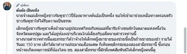 นายจ้างแม่เด็กหญิงชาวกัมพูชา 13 ปีร้องมาทางต้นอ้อเป็นหนึ่ง ขอให้เข้ามาช่วยเหลือทางครอบครัวชาวกัมพูชาให้ได้รับความเป็นธรรม