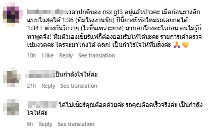 “เวลาปกติของ nsx gt3 อยู่แล้วป่าวคะ เมื่อก่อนยางอีกแบบไวสุดได้ 1:36 (ทีมโรงงานขับ) ปีนี้ยางยี่ห้อใหม่รถเลยกดได้ 1:34+ ต่างกันวิกว่าๆ (ไวขึ้นเพราะยาง) มาบอกโกงอะไรก่อน คนไม่รู้ก็หาพูดจัง! ทีมตัวเองเชียร์แพ้ก็ต้องยอมรับให้ได้นะคะ รายการเค้าตรวจเข้มงวดคะ ใครจะมาโกงได้ ตลก! เป็นกำไรใจให้ทีมสิงค่ะ”