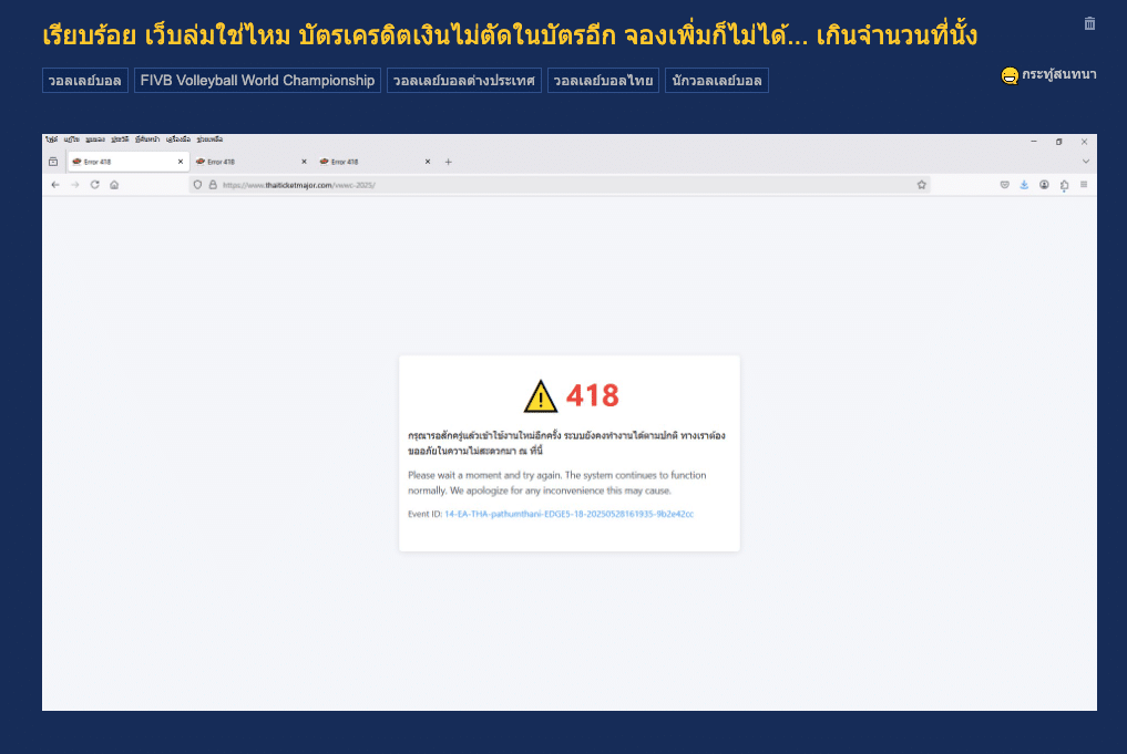 ไทยเกอร์ รายงานบรรยากาศการเปิดจำหน่ายบัตรเข้าชมการแข่งขัน วอลเลย์บอลหญิงชิงแชมป์โลก 2025 (FIVB Volleyball Women’s World Championship 2025) ที่ประเทศไทยเป็นเจ้าภาพ วันแรก 28 พฤษภาคม 2568 เวลา 15.00 น. ทางเว็บไซต์ ThaiTicketMajor.com
