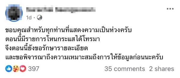 ล่าสุดมีอัปเดตจากทางเจ้าของโพสต์อีกครั้งหลังจากทางทีมงาน โหนกระแส ได้มีการติดต่อไปสอบถามเรื่องราวทั้งหมดที่เกิดขึ้น โดยระบุว่า “ขอบคุณสำหรับทุกท่านที่แสดงความเห็นห่วงครับ ตอนนี้มีรายการโหนกระแสได้โทรมา ตอนนี้ยังขอรักษารายละเอียด และขอพิจารณาถึงความเหมาะสมถึงการให้ข้อมูลก่อนนะครับ”