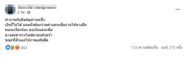 ผู้ใช้เฟซบุ๊กดังกล่าว เขียนข้อความผ่านหน้าเฟซบุ๊กระบุว่า “ทำงานกับอินฟลูฯ ท่านหนึ่ง เงินก็ไม่ได้ แถมยังต้องจ่ายค่าแคนเซิลงานให้นางอีก พอจะเรียกร้องขอเงินแคนเซิล นางส่งตำรวจไลน์มาคุยด้วยจ้า ขณะที่ตัวเองไปงานแฟนมีต” ข้อความนี้ได้จุดชนวนให้เกิดการวิพากษ์วิจารณ์อย่างหนักถึงพฤติกรรมที่ไม่เป็นมืออาชีพ และการใช้อำนาจในทางที่ไม่ถูกต้อง