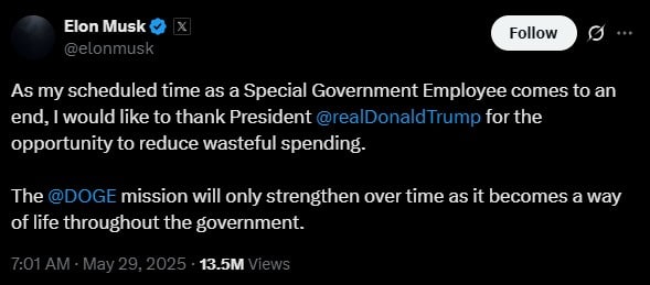 เมื่อช่วงเช้าวันนี้ (29 พฤษภาคม) ตามเวลาประเทศไทย อีลอน มัสก์ (Elon Musk) ซีอีโอคนดังของเทสล่า ได้โพสต์ข้อความผ่านทาง X ว่าเขาได้ออกจากคณะบริหารรัฐบาลโดนัลด์ ทรัมป์ ผู้นำสหรัฐฯคนปัจจุบัน หลังจากช่วยผลักดันให้รัฐบาลมีขนาดเล็กลง จนส่งผลให้มีการเลิกจ้างเจ้าหน้าที่รัฐหลายพันคน โดยข้อความระบุว่า