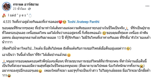 ก่อนหน้านี้ กระแต อาร์สยาม ก็เพิ่งจะโพสต์ข้อความเปิดใจ หลังถูกแฟนหนุ่มคุกเข่าขอแต่งงาน ระบุว่า “I said “y e s” 4,535 วันที่เราอยู่ด้วยกันและที่เรารอคอย