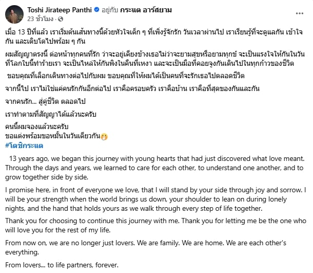โตชิ จิรทีปต์ เขียนร่ายยาวความในใจถึงว่าที่ภรรยา “กระแต อาร์สยาม” หลังคุกเข่าขอแต่งงานฉลองครบรอบ 13 ปี ‘เราคือที่สุดของกันและกัน’