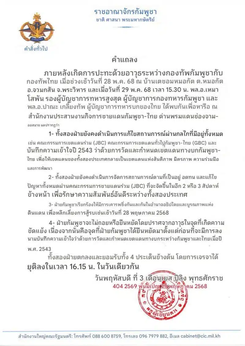 3.ฝ่านกัมพูชาเรียกร้องให้มีการเคารพซึ่งกันและกัน ในอำนาจอธิปไตยและบูรณภาพแห่งดินแดง เพื่อหลีกเลี่ยงการสู้รบเช่นเช้าวันที่ 28 พ.ค. 68