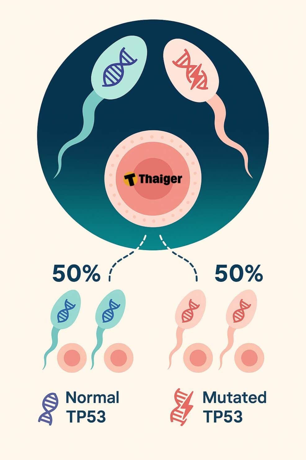 เมื่อเขาบริจาคสเปิร์ม สเปิร์มแต่ละตัวจึงมีโอกาส 50% ที่จะมียีน TP53 ที่กลายพันธุ์ไป ดังนั้น เมื่อนำสเปิร์มไปผสมกับไข่ หากสเปิร์มตัวนั้นมียีนกลายพันธุ์ ลูกที่เกิดมาก็จะได้รับยีนกลายพันธุ์ไปหนึ่งชุด แต่หากสเปิร์มตัวนั้นมียีนปกติ ลูกที่เกิดมาก็จะไม่มียีน TP53 กลายพันธุ์ นี่คือเหตุผลว่าทำไมในเด็ก 67 คน มีเพียง 23 คนเท่านั้นที่ได้รับยีนกลายพันธุ์ไป