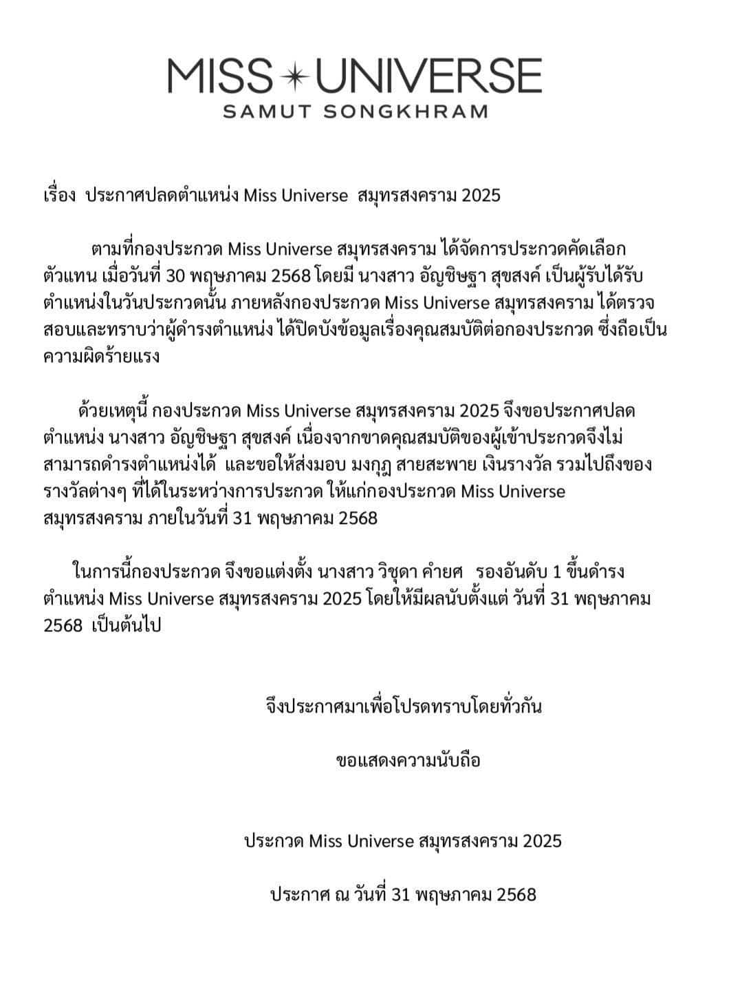 ด้วยเหตุนี้ กองประกวด Miss Universe สมุทรสงคราม 2025 จึงขอประกาศปลดตำแหน่ง นางสาว อัญชิษฐา สุขสงค์ เนื่องจากขาดคุณสมบัติของผู้เข้าประกวด ไม่สามารถรับตำแหน่งได้ และขอให้ส่งมอบ มงกุฎ สายสะพาย เงินรางวัล รวมไปถึงของรางวัลต่าง ๆ ที่ได้ในระหว่างการประกวด ให้แก่กองประกวด Miss Universe สมุทรสงคราม ภายในวันที่ 31 พฤษภาคม 2568