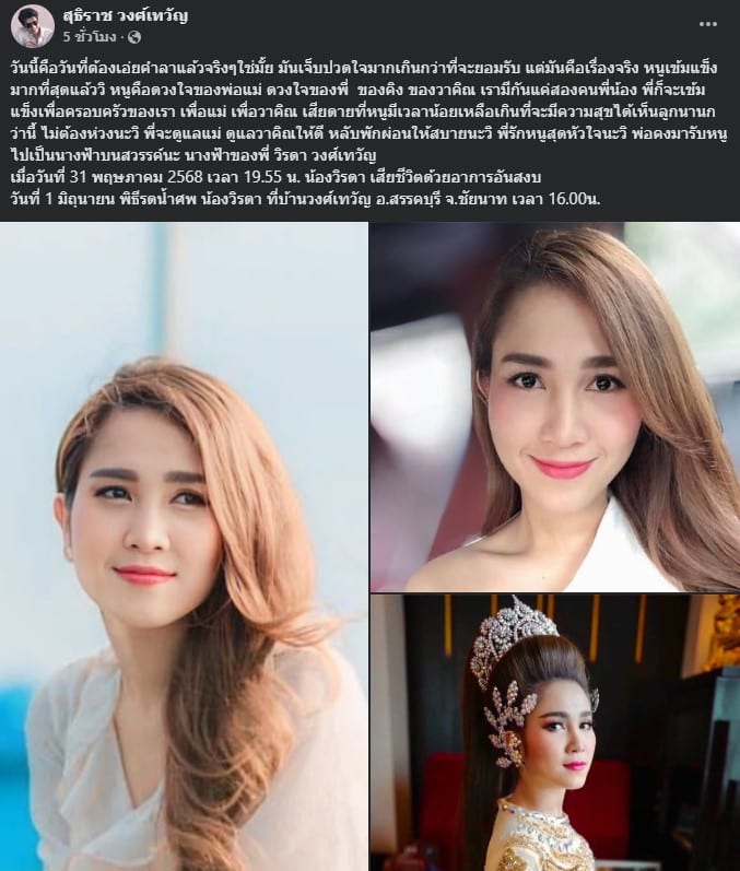 “เมื่อวันที่ 31 พฤษภาคม 2568 เวลา 19.55 น. น้องวิรดา เสียชีวิตด้วยอาการอันสงบ วันที่ 1 มิถุนายน พิธีรดน้ำศพ น้องวิรดา ที่บ้านวงศ์เทวัญ อ.สรรคบุรี จ.ชัยนาท เวลา 16.00น.”