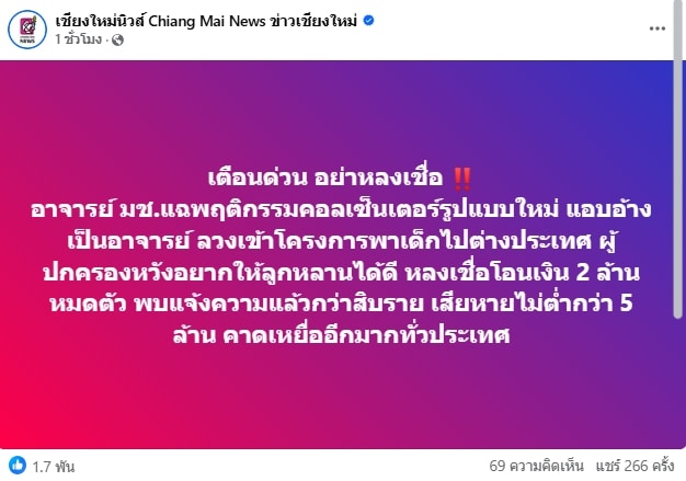 เพจดังเตือนอย่าหลงเชื่อ แก๊งคอลเซ็นเตอร์ ออกอุบายอ้างเป็นอาจารย์ม.ดังเชียงใหม่ ลวงนศ.เข้าร่วมโครงการทุนไปต่างประเทศ หลอกผู้ปกครองสูญเงินกว่า 2 ล้าน