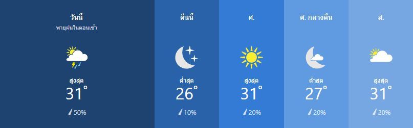 มีพายุฟ้าคะนองในตอนเช้า สูง 31เซลเซียส ความเร็วลม ตะวันตกเฉียงใต้ ที่ 10 ถึง 15 กิโลเมตรต่อชั่วโมง โอกาสที่ฝนจะตก 50%